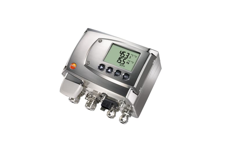 testo 6381压差变送器具有同时计算体积流量和流速的优势。配备温湿度探头后,这款变送器也可以进行温度和湿度测量。